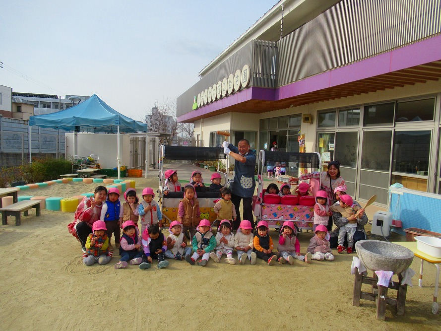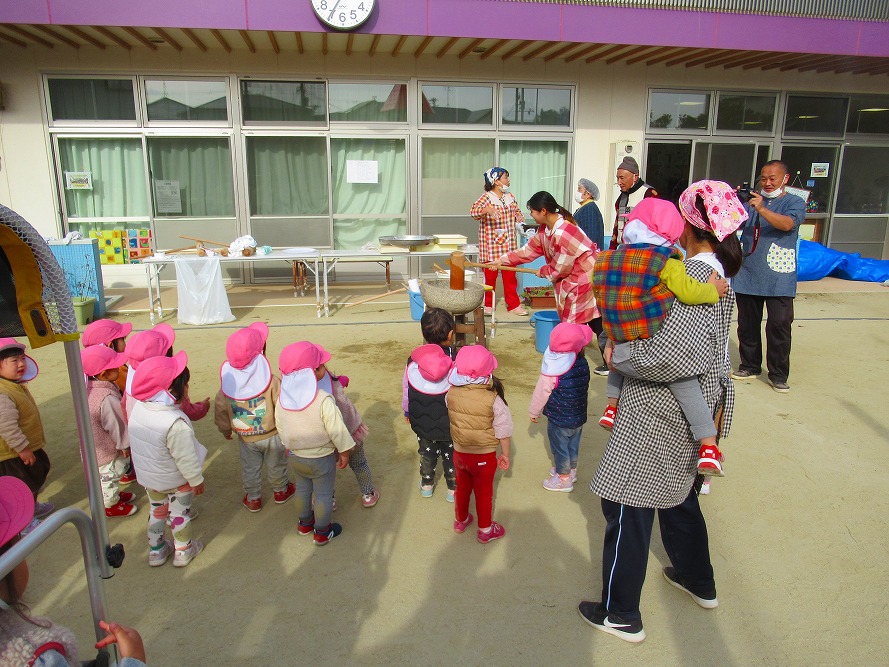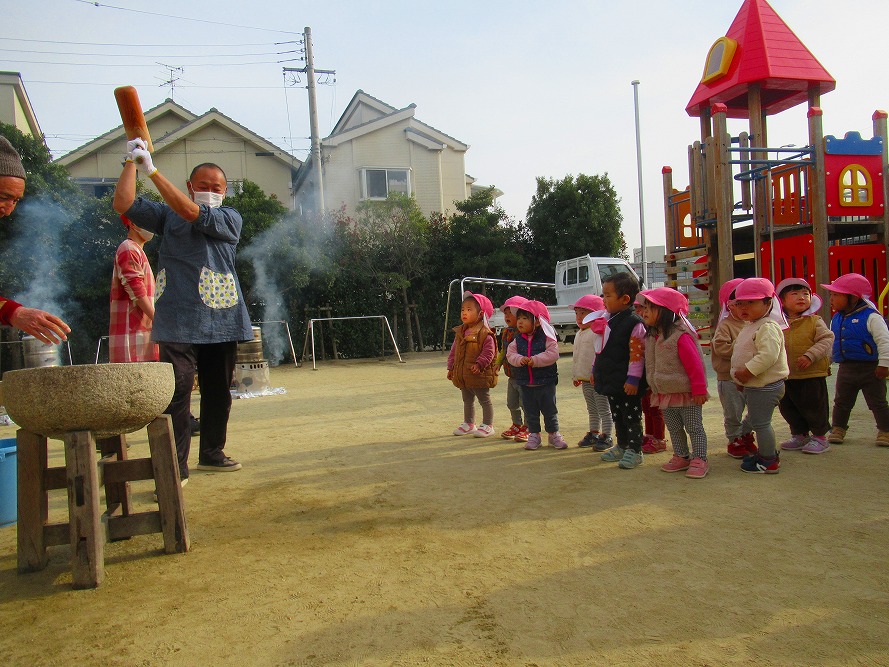 おもちつきでは、先生たちがついている姿を見て「頑張れ~」と応援したり、