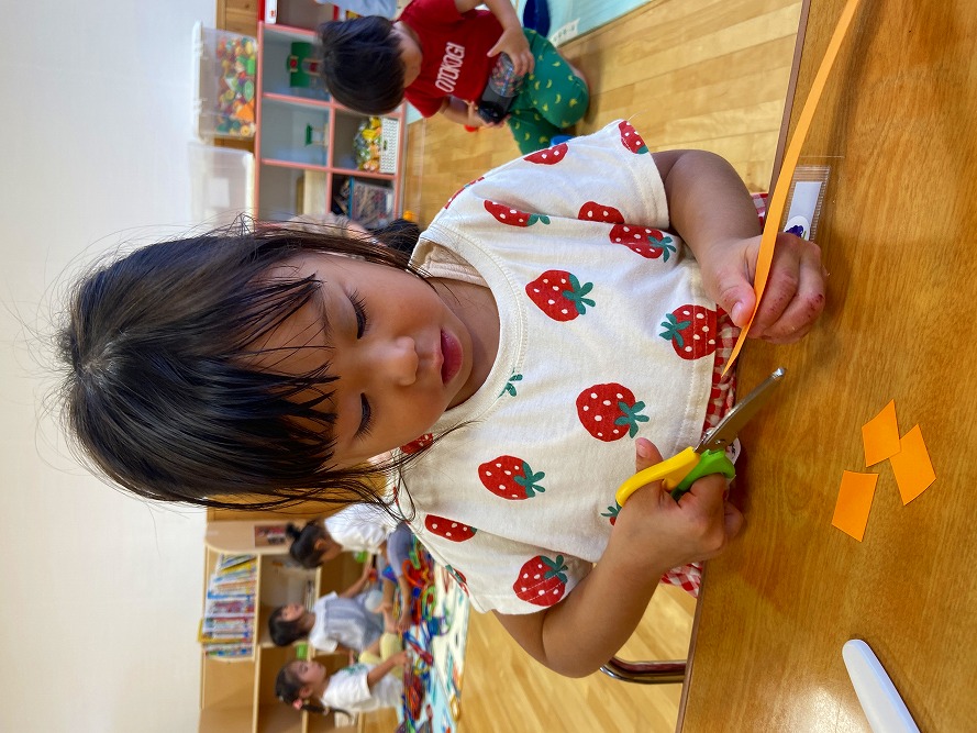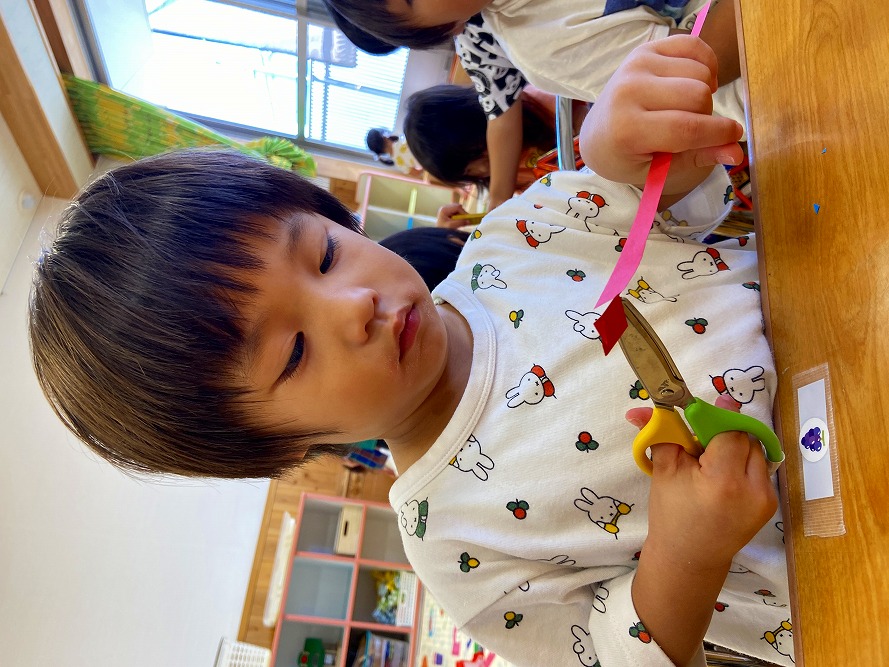 お部屋では、はさみの一回切りに挑戦しています。はさみの持ち方やお約束事をしっかりと聞いて実際に切ってみました。何度かチャレンジしていくうちにどんどん上手になってきていますよ☆