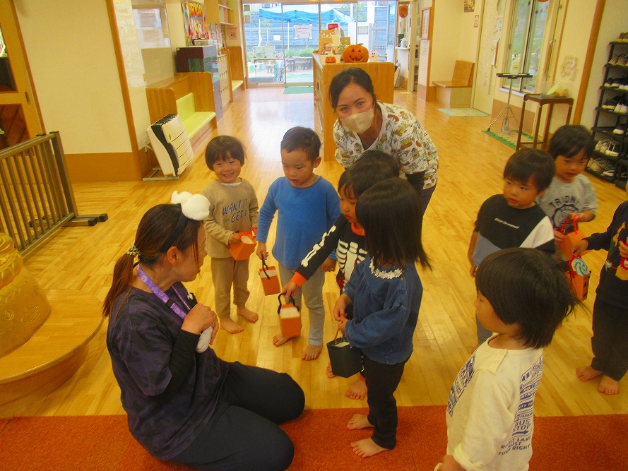 10/31日はハロウィンです🎃自分たちで選んで作ったカバンを持って園内を探索しました。4つのグループに分かれて、チーム名やメンバーも自分たちで決めました。仮装している先生を見つけると「トリックオアトリート!!」と大きな声で言っておかしを貰いました。カバンを作っている時から「おかし貰えるねんで~」「怖くないで~」など子どもたち同士でお話をしながらこの日を楽しみにしていました♪